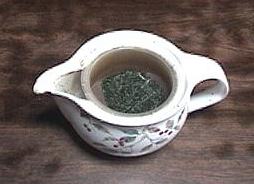 2、お茶の葉を急須に入れます。 湯の量300cc3〜5人分で、6〜8gのお茶の葉を使います。(大さじ1杯強) |