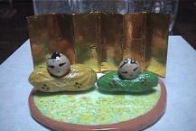 | 作るよ・・・ | 落花生を写真のように置いたとき、安定が良いものを選んで、安定が良くないときは底をカッターナイフで、少し削る。 銀杏が入るくらいの穴を落花生の中央にカッターナイフであける。中の落花生の実をしっかりだしてね。 目打ちで出すと出しやすい。絵の具で、銀杏に顔を書く。 落花生に好みの色を塗り、乾いたら襟元に線を入れ、袖の模様も好みで入れる。絵の具が乾いたら、スプレーニスを塗る。 空き箱は5センチx12センチに切って2センチ間隔で折り目をつけて、金の色紙を貼って屏風を作る。 ニスが乾いたら、落花生の中におもり用に小石を入れて安定を良くする。ボンドで頭と胴を接着して飾る。 お雛様の下の台は、コースター、お皿なんでもいいです。 |