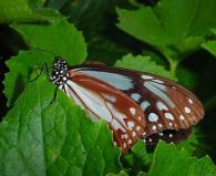 夕暮れ時、冬瓜の葉に羽を休めているアサギマダラを見つけました。 秋になると、時々このあたりを飛ぶようです。(きんととはこの土地に住むまで、低地で見られるとは思っていなかった) 蝶々の飛ぶさまを表現すると「ひらひら」という言葉が一般的。でも、アサギマダラは実に、華麗に優雅に気流に乗り、うっとりと見とれてしまいます。 |