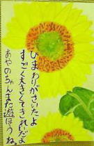 東日新聞社の絵てがみコンクールでパキラの作品が「東日準大賞」に選ばれた。審査にあたった米津一八氏から「東日準大賞の作品は、ヒマワリのパッと咲いた感じがよく出て周囲の人を明るくする」との講評。作品は、豊橋駅ビルカルミア4階のオープンスペースに展示された。 そこで、パキラとオババさまとオトウときんととは行ってきました。やはり、どの作品もすばらしいです。本物を自分の目で見ないとそのものの良さはわかりません。色使いといい、とっても素敵に表現されているんです。ポッと心を暖かく包まれたようなそんな気持ちになって帰ってきました。9月に入って、東日新聞社に賞状と賞品をいただきに行ってきました。 とても大きな賞品で、新聞社の階段をパキラはエッチラオッチラと抱えて降りました。今は、パソコンの部屋の真中に「エヘン!!」といった感じでパキラが学校から帰ってきて座ってくれるのを待ってます。 |