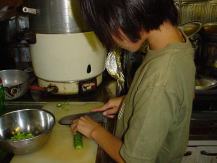 13日金曜日、学校でゴーヤーチャンプルーを作って食べてきたパキラ。出来は上々だったようだ。 15日の夜は「私が作るから」とコソコソと台所で活動しだした。きんととは、見事に脇役で「ハイ、 洗って」「ハイ、冷蔵庫から出して」のパキラの指図で言われた通りにお手伝い。この時は、きんとと とパキラのいつもの立場が逆転。パキラの炒める手つきも様になってきた。お皿に盛って、ゴーヤーチ ャンプルーが食卓に上る。「今日は、パキラ作のゴーヤーチャンプルーだからね」「いただきまーす」 「塩味がちょうどいいじゃん」「おいしいじゃん」売れ行きも良く、全てたいらげた。パキラおみごと! レシピは「きんととのいただきま〜す」でどーぞ。 |