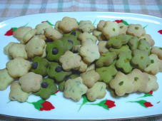 クッキー5種 【茶葉クッキー】 薄力粉200グラム、煎茶大匙1、ベーキングパウダー5グラム、バター120グラム、砂糖80グラム、卵1個、おろしたレモン皮と搾り汁ともに小さじ1 【ほうじ茶クッキー】 薄力粉200グラム、ほうじ茶大匙1、ベーキングパウダー5グラム、バター120グラム、砂糖80グラム、卵1個、おろしたレモン皮と搾り汁ともに小さじ1 【お茶クッキー】 薄力粉200グラム、粉末緑茶10g、ベーキングパウダー5グラム、バター120グラム、砂糖80グラム、卵1個、おろしたレモン皮と搾り汁ともに小さじ1、夏みかんの皮の甘煮 【ニガニガお茶クッキー】 薄力粉200グラム、粉末緑茶10g、ベーキングパウダー5グラム、バター120グラム、砂糖80グラム、卵1個、おろしたレモン皮と搾り汁ともに小さじ1、チョコレート適量 【レモンクッキー】 薄力粉210グラム、ベーキングパウダー5グラム、バター120グラム、砂糖80グラム、卵1個、おろしたレモン皮と搾り汁ともに大匙1 【茶葉クッキー】【ほうじ茶クッキー】 1、薄力粉とベーキングパウダーは一緒にふるいにかける。 2、バターはすり混ぜてクリーム状にしたら砂糖を混ぜて白っぽくなったら溶いた卵を少しずつ混ぜる。 3、次にレモンの皮のすりおろしたものと搾り汁を混ぜる。 4、【茶葉クッキー】は急須で煎茶を出し、軽く搾った茶葉を混ぜる。【ほうじ茶クッキー】は急須でほうじ茶を出したお茶と、軟らかそうな茶葉を急須から取り出して細かく刻んで混ぜる。 5、1を入れて混ぜ、冷蔵庫で1時間寝かす。 6、3〜4oの厚さにのして型を抜いて、天板にシートを敷いて並べ180度に熱したオーブンで12分焼いたら出来上がり。 【お茶クッキー】 【ニガニガお茶クッキー】 1、薄力粉とベーキングパウダー 【お茶クッキー】 または【ニガニガお茶クッキー】の分量の粉末緑茶は一緒にふるいにかける。 2、バターはすり混ぜてクリーム状にしたら砂糖を混ぜて白っぽくなったら溶いた卵を少しずつ混ぜる。 3、次にレモンの皮のすりおろしたものと搾り汁を混ぜる。 4、1を入れて混ぜ、冷蔵庫で1時間寝かす。 5、3〜4oの厚さにのして型を抜いて、天板にシートを敷いて並べ、【お茶クッキー】は夏みかんの皮の甘煮をきざんで、 【ニガニガお茶クッキー】はチョコレートをトッピングして180度に熱したオーブンで12分焼いたら出来上がり。 【レモンクッキー】 1、薄力粉とベーキングパウダーは一緒にふるいにかける。 2、バターはすり混ぜてクリーム状にしたら砂糖を混ぜて白っぽくなったら溶いた卵を少しずつ混ぜる。 3、次にレモンの皮のすりおろしたものと搾り汁を混ぜる。 4、1を入れて混ぜ、冷蔵庫で1時間寝かす。 5 、3〜4oの厚さにのして型を抜いて、天板にシートを敷いて並べ【ニガニガお茶クッキー】を花芯につけ180度に熱したオーブンで12分焼いたら出来上がり。 ※※レモンの皮と搾り汁を入れることでさっぱりしたクッキーの仕上がりになります。 5種のクッキーの味を楽しんでね。 小学6年のパキラはクッキーを焼いているときがとっても楽しいみたい。最近では、全てマスターして一人で焼けるようになりました。 2004/04/07 |