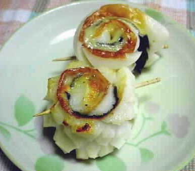 イカサマ巻き ちくわ、乾のり、とろけるチーズ、サラダオイル 1、ちくわは縦に切り開いて中側を出す。 2、切りすぎないように注意して右上から左下へ斜めの切り込みを3mm位の間隔で入れたら左上から右下へも同じように斜めの切り込みを入れる。 3、ちくわの大きさと同じ乾のりととろけるチーズを用意して、ちくわの焼いてある面を出しておきクルクルと巻いて爪楊枝2、3本でとめる。 4、3を切ってサラダオイルをしいたフライパンで焼いて出来上がり。 ※ちくわの内側に入れる切り込み模様がまるでイカみたい。イカだと思ってパクッとやったらなぁーんだちくわじゃん。でもおいしいからいい じゃん。これ、イカサマじゃん。それから名前はイカサマ巻き。お弁当にも、おつまみにもOK。中に入れて巻き込むものは、その時の気分で いろいろとお試しあれ! 2003/04/13 |