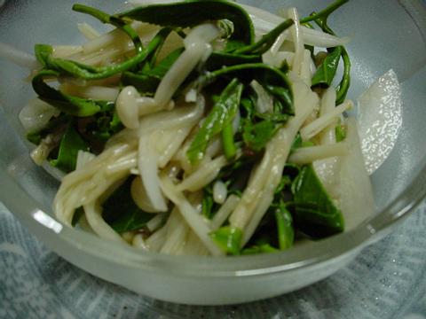 間引きかぶとニンジンの胡麻和え 間引きしたかぶの抜き菜、ニンジン、ごま、醤油、砂糖、塩 1、かぶの抜き菜は、細い根を取り洗ったら塩茹でにして冷水にとり、水を切っておく。 2、ニンジンは、一本を四つに縦に割り塩茹でしてから、イチョウ切りにする。 3、1をギュッと絞り、適当な長さに切り、ごま、醤油、砂糖で好みの味にごまだれを作り2と和えていただく。 ※11月になると毎年いただくかぶの抜き菜です。 お味噌汁に入れたり、漬物にしたりしてもいいのですが、ニンジンとごま和えにすると 緑とオレンジの色合いがとても鮮やかで子供たちは喜んで食べます 2002/11/23 |